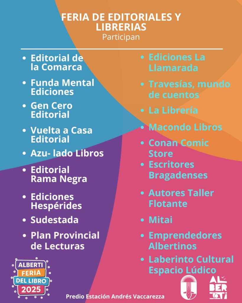 Los primeros dos días, 2 y 3 de octubre, estarán dedicados especialmente a la comunidad educativa, con talleres y actividades abiertas al público en general. El 4 y 5 de octubre será el turno de la feria de editoriales, donde más de 20 sellos y librerías de la región desplegarán sus catálogos para acercar las últimas novedades y grandes clásicos al público lector. Entre ellos, estará presente Editorial De la Comarca con un stand propio, compartiendo sus publicaciones y propuestas con la comunidad.